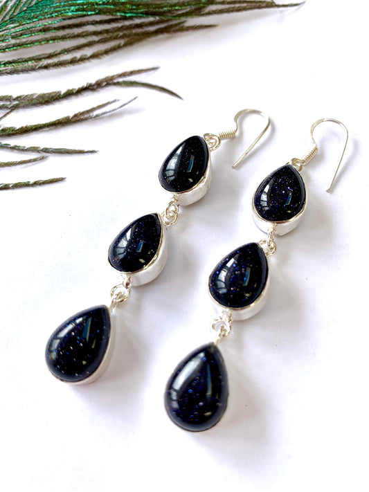 Blue Goldstone 3 Stone Gemstone Dangle Earrings